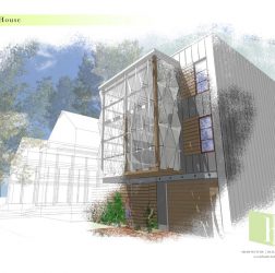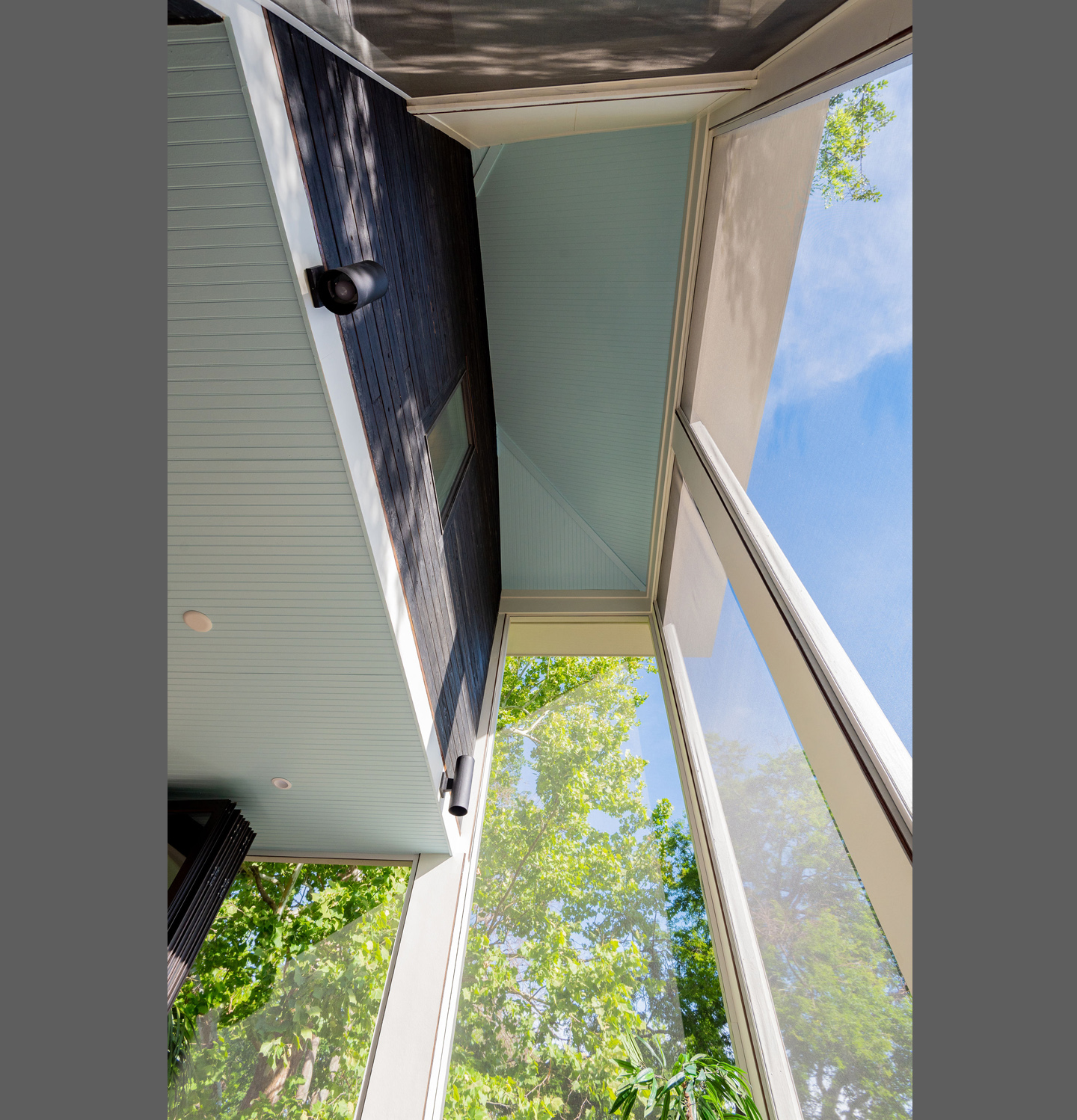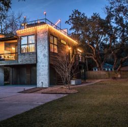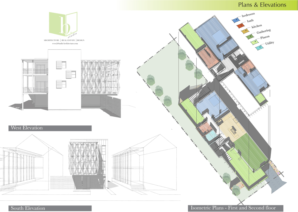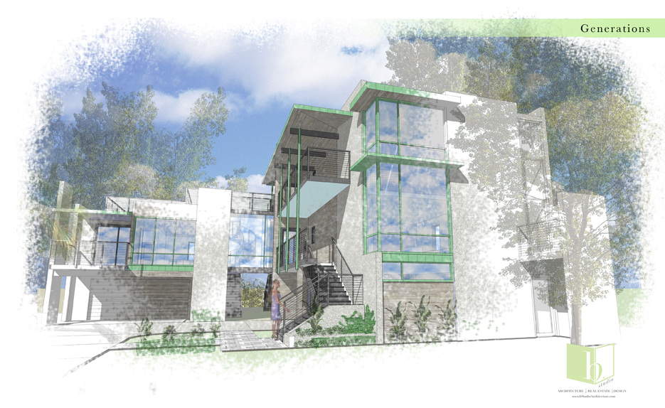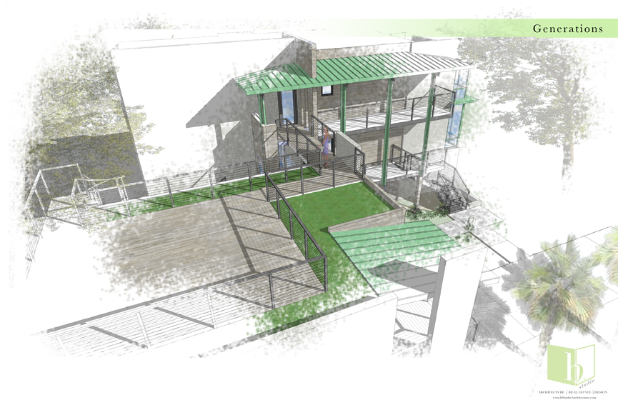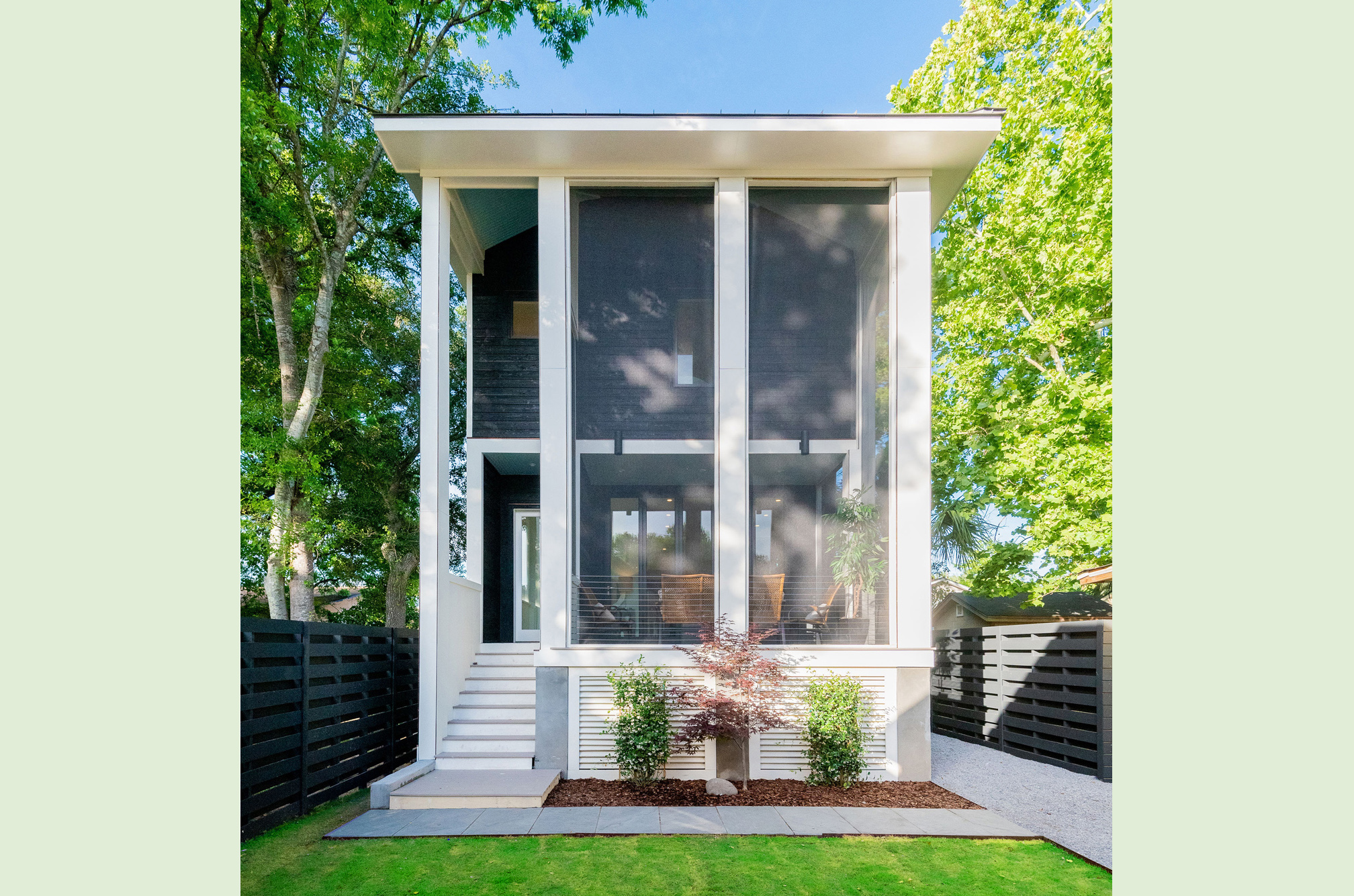 This estate home perches itself on an ocean bluff surrounded by lush Oaks and sub-tropical brush. Greeted by a carriage house at the gate, the elevated home allows for a grand entrance and a mix of traditional shingle shake siding and brick in a modern color pallet. Tall glazed walls allow the main living space to view forward while the rear of the space has oversized pocked glass walls that slide open onto a screened area and pool deck. A large kitchen with catering space is connected by a formal dining area to the great room for endless entertaining space. A secluded main floor master suite captures views toward the water, while a private office perches over the drive to welcome guests. A mix of dark shake shingles, light brick, and copper roofs mix up the traditional material pallet into a modern beach retreat.